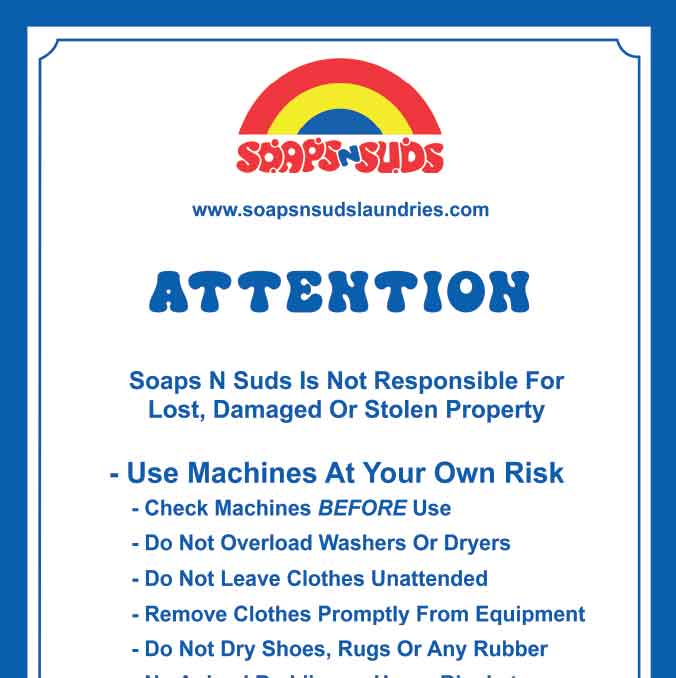 Soaps N Suds Laundromat Rules and Policies Our laundry attendants have the right to enforce these rules when necessary for